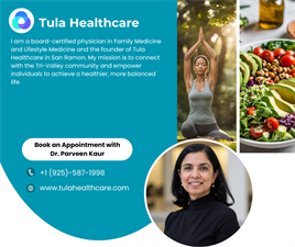 Tula Healthcare PC, nestled in the vibrant San Ramon community, specializes in providing comprehensive primary care services for individuals and families in Danville, Dublin, and Pleasanton. We specialize in preventive care, chronic disease management, and holistic treatments that promote overall well-being. Our approach embraces traditional medicine alongside lifestyle medicine principles, empowering patients to take an active role in their health journey.Led by the experienced founding physician, Parveen Kaur, MD, Tula Healthcare is committed to delivering compassionate and effective healthcare for those they serve.